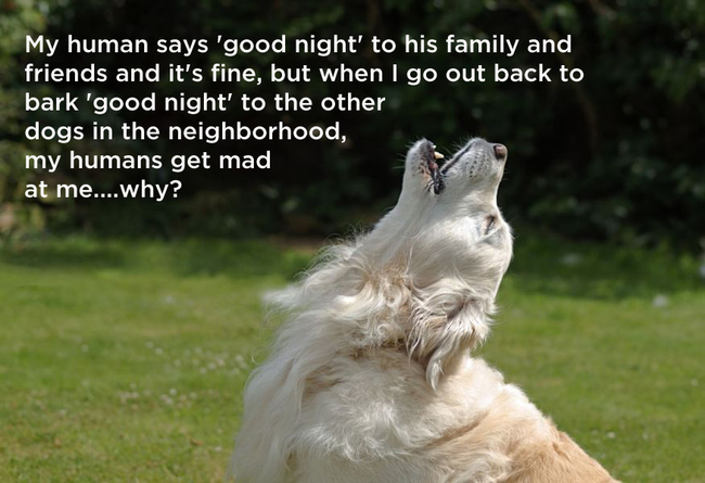 Мојот сопственик им вели „добра ноќ“ на семејството и пријателите и тоа е во ред, а кога јас ќе излезам надвор за да им лаам за добра ноќ на другите кучиња од соседството, луѓето му се лутат… Зошто?