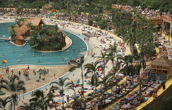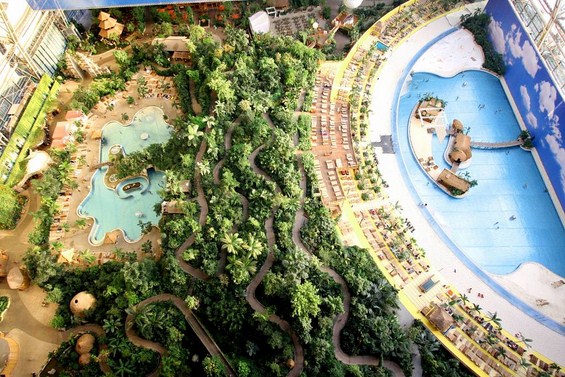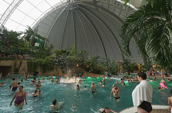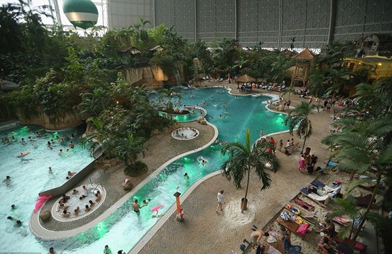 Овој „ресорт“ е во суштина сместен во внатрешноста на поранешната воздухопловна база на Советскиот сојуз, во Краушник, Германија. Под куполата на советскиот хангар, се наоѓа прав тропски рај! Можеби ви изгледа како тука температурите да се високи, но надвор од хангарот, всушност паѓа снег. Колку е тоа неверојатно?! 🙂