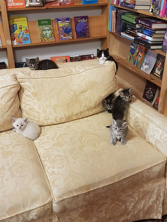 Таа вели дека луѓето почнале да доаѓаат специјално за да си земат маче, а некои од нив доаѓале за да си купат книга, па случајно наидувале и на мачињата. Во секој случај, решението е навистина одлично – кој не сака мачиња, нели?