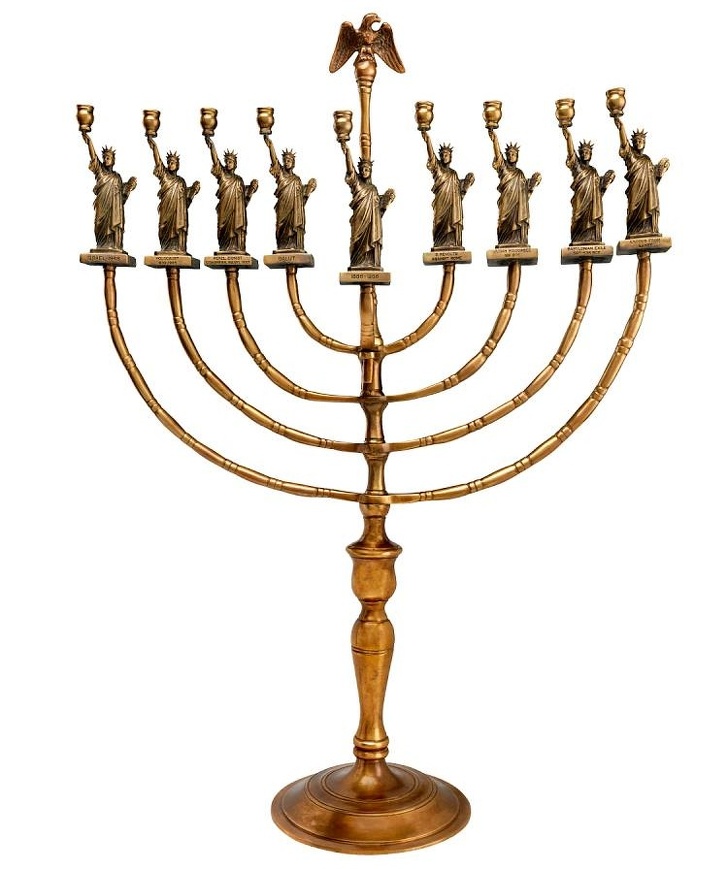 22. Свеќник направен од 9 мали Статуи на слободата со важни еврејски дати на нив