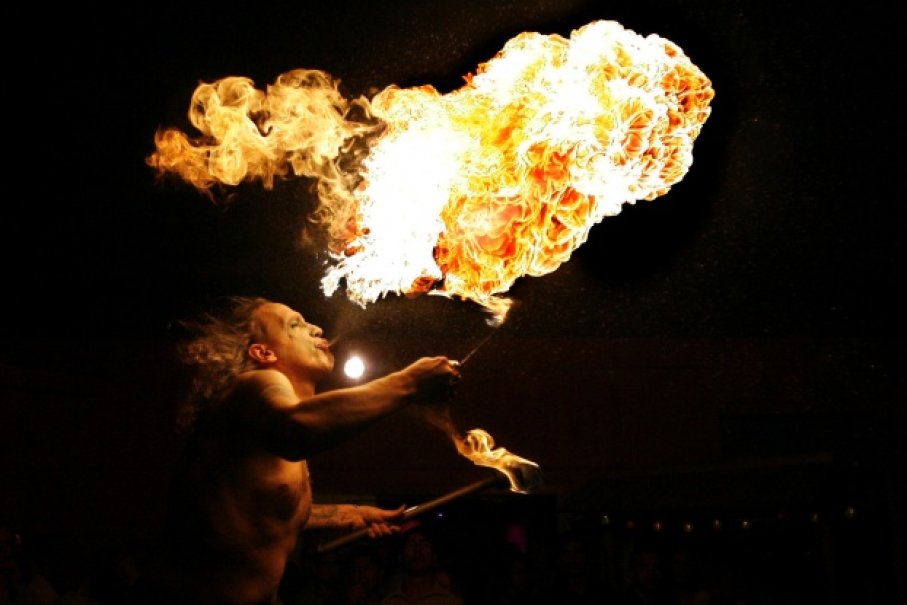 Ајде да погледнеме како се одвива овој акт низ неколку чекори. Прво, артистот става некакво гориво во неговата уста – керозин, бензин или некоја алкохолна запалива течност. Потоа го прска горивото низ устата. Следно, го пали испрсканото гориво со мал рачен факел. Овие артисти не им веруваат на запалките и на кибритот, па секогаш користат факел.