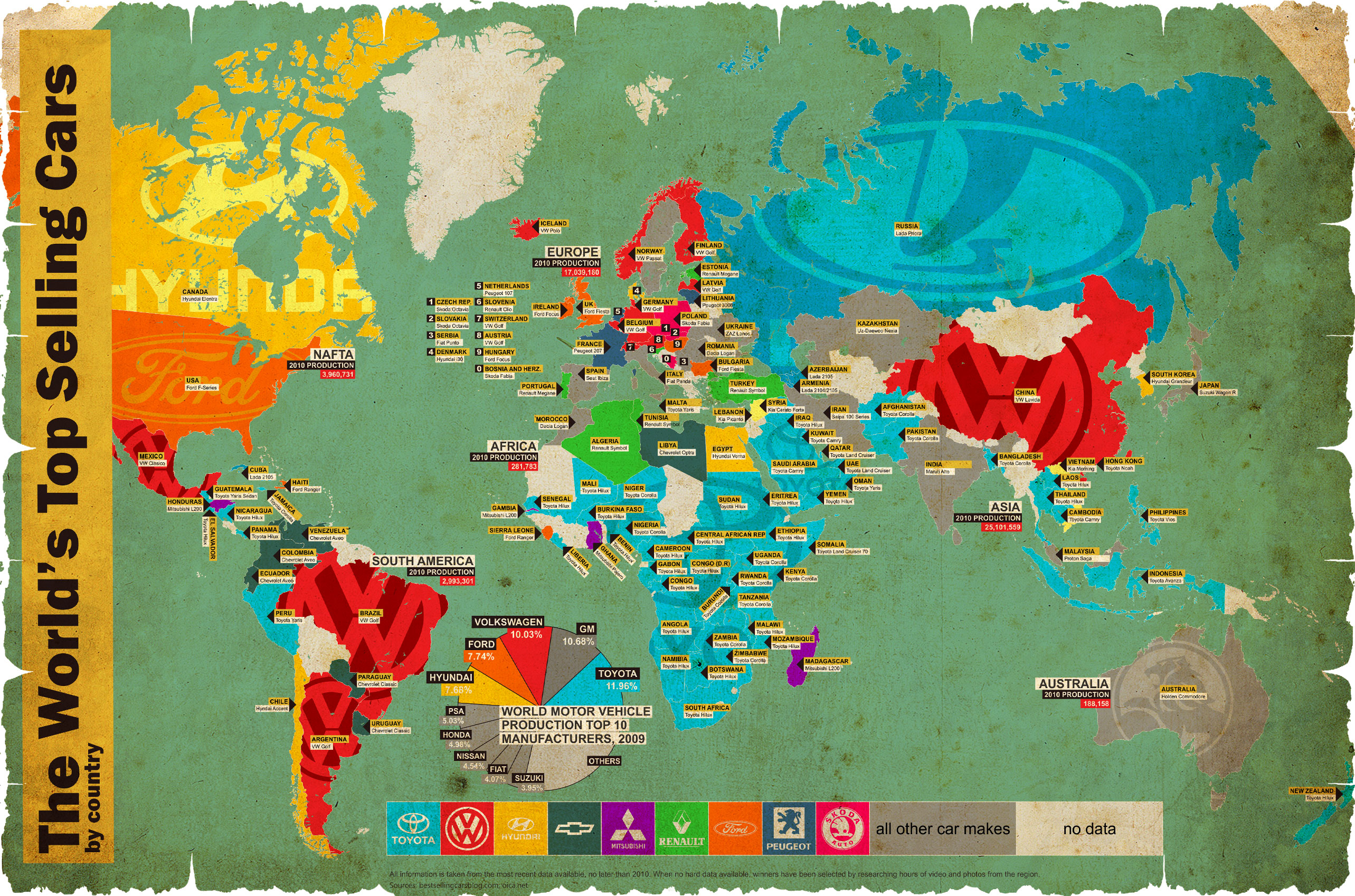 Овој интересен график е направен со податоци кои датираат од крајот на 2010 година. Можеби не се добиени некои неочекувани резултати, но сепак интересно е да се погледне која кола е најпродавана во повеќето земји од светот. Нормално, во земјите каде што се произведува некој бренд, таму со сигурност е автомобилската марка е и најпродавана, па така во Италија владее „Фиат“, во Франција „Пежо“, во Германија „Фолксваген“, во САД „Форд“ и така натаму. Нашата земја ја нема на оваа мапа, а од земјите од балканските простори, во Србија владее „Фиат Пунто“, во Босна и Херцеговина „Шкода Фабија“, во Словенија „Рено Клио“, и во Бугарија „Форд Фиеста“. Што мислите вие која кола е најпродавана во Македонија?