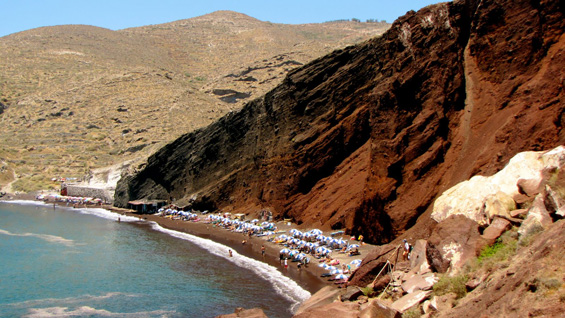 Иако овој грчки остров има многу плажи, сепак најнеобична е Црвената плажа која има облик на млада Месечина. Заради посебните географски карактеристики и вулканската активност, брегот на оваа плажа е црвен и црн. Карпите создадени од лавата полни со железо, навлегуваат длабоко во Егејското Море. Во текот на летните месеци, Црвената плажа нуди луди вечерни журки во крајбрежните клубови.