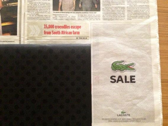 Весникот „Мумбаи мирор“ (Mumbai Mirror) нашол совршено место за реклама на популарниот бренд „Лакост“. Ја сместил веднаш до веста „15.000 крокодили избегале од фарма во Јужна Африка“. Генијално!