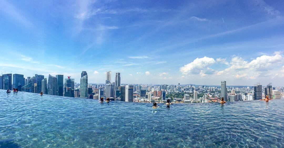 Станува збор за водена тераса со поглед кон градот. Овој базен се наоѓа во најпопуларниот ресорт во Сингапур, како дел од Небесниот парк на кровот на Марина Беј Сендс, на 57-миот спрат. Поради својата неверојатна локација, овој хотел е прогласен за најчесто објавуваниот на Инстаграм за 2017 година.