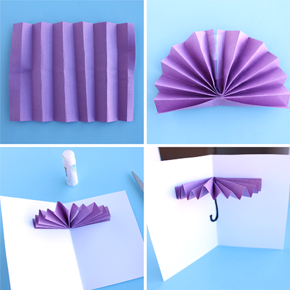 Земете бел лист хартија кој ќе ви биде честитка и превиткајте го на два еднакви дела. Потоа, земете еден од колажните листови во боја и свиткајте го како хармоника, па соберете го и свиткајте го на пола и залепете го на средината од честитката, како на сликата. Потоа, под хартијата која ја залепивте (а која претставува чадор) нацртајте му рачка на чадорот и девојче или момче кое го држи чадорот.