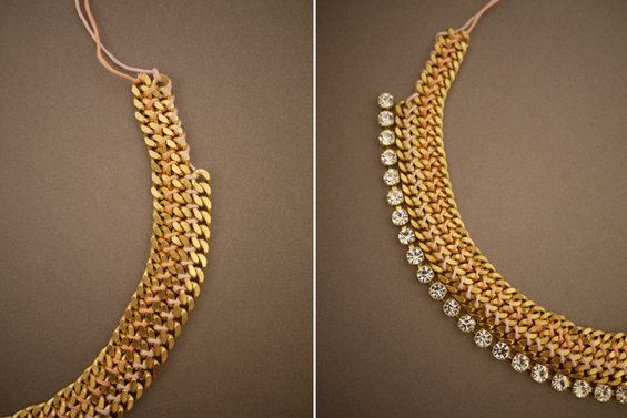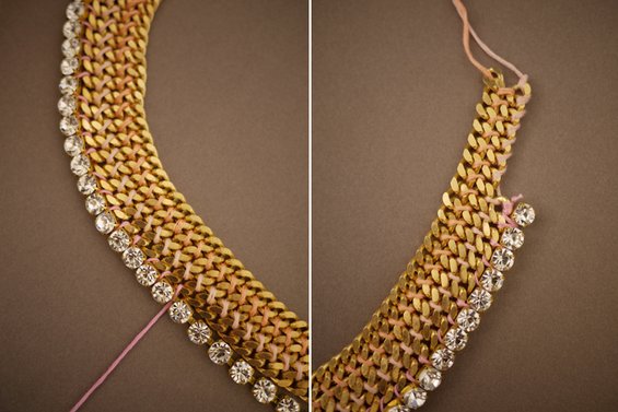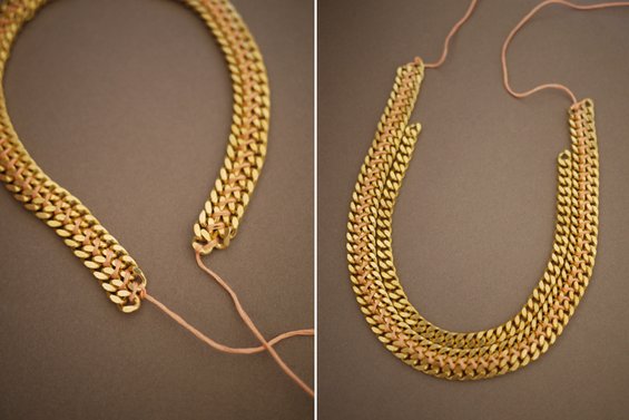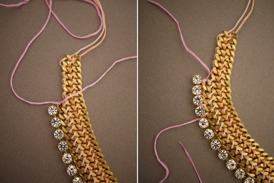Со третиот конец, внимателно врзете го ланчето со веќе поврзаните делови, како што е прикажано на сликата. Додека го врзувате со конецот, поставете го ланчето во заоблена положба, како да е веќе ставено на нечиј врат, со цел да не се витка и деформира.