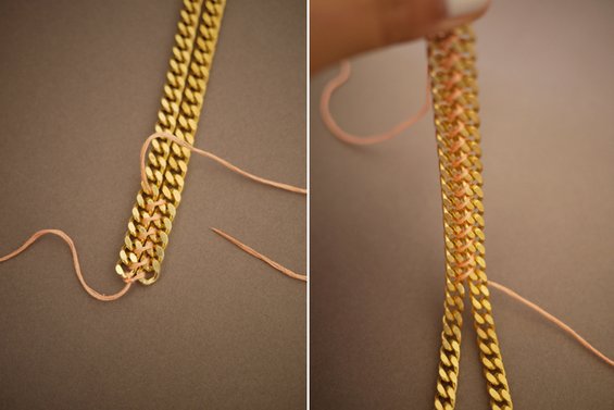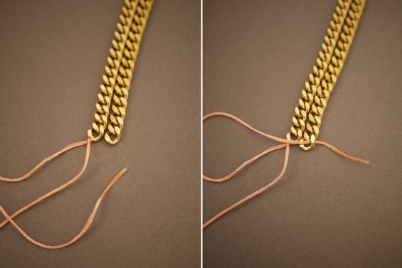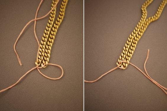 Поставете два дела од потенкиот ланец еден до друг. Исечете околу 120 см од еден од конците и врзете го дупло на едниот крај од ланецот, како на сликата.