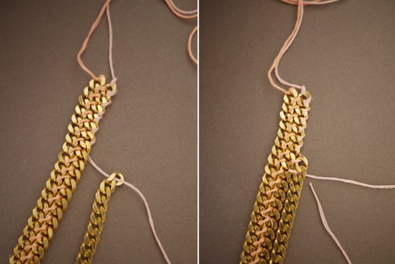 Конецот кој ви остана врзете го за крајот од другиот ланец. Продирајте го конецот наизменично во двата дела од ланецот, потоа врзете го на крајот.