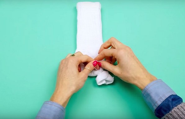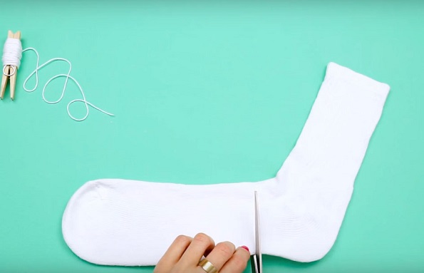 1. Најдобро е да изберете чорапи во бела боја, затоа што снешкото е бел, но можете да испробувате и со други бои. Најпрво треба да го исечете чорапот малку под петата.