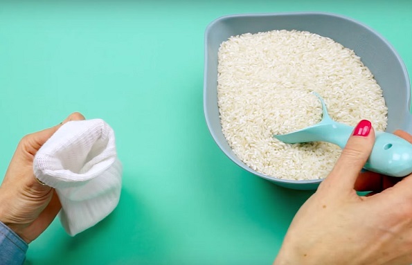 3. Превртете го чорапот пак на лице и наполнете го со ориз, просо или амарант, речиси до врвот.
