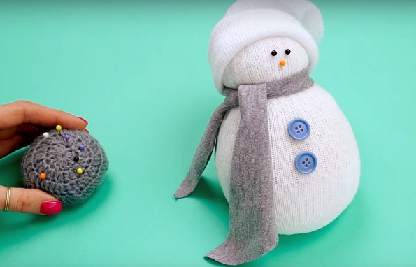 5. Залепете ги копчињата на неговото тело, а остатокот од чорапот искористете го за да направите капа за снешкото.