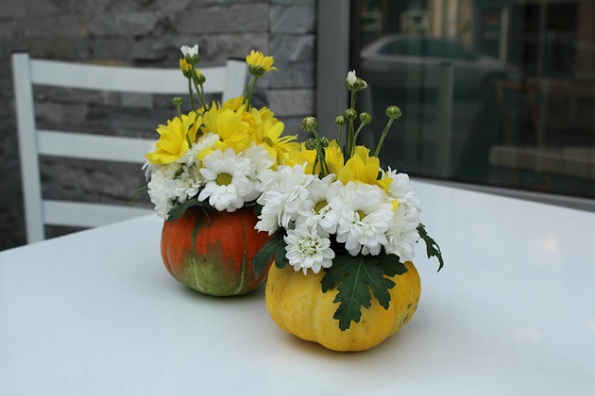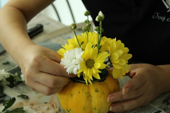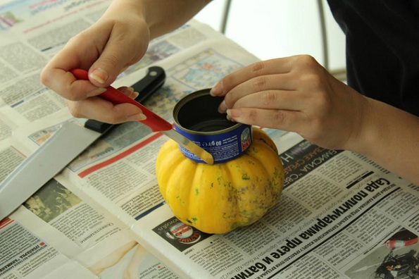 1. Одберете тиква со големина по ваша желба и обележете место за конзервата. Внимавајте таа да биде доволно голема за во неа да застанат цвеќињата, но и да можете да ја ставите во тиквата.