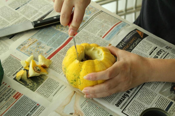 2. Потоа, со лажичка исчистете ја тиквата така што ќе можете да ја ставите конзервата внатре, а извадете ги и семките од средината.