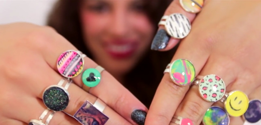 За оваа изработка, сè што ви е потребно е лепило, прстени со празна основа (можат да се најдат во продавниците за накит), држач за прстени (каде што ќе ги оставите да се исушат) и лак за нокти. Доколку сакате одредени дизајни, можете дури и да испечатите одредена фотографија, во многу мала верзија, со цел да можете да ја поставите врз прстенот.