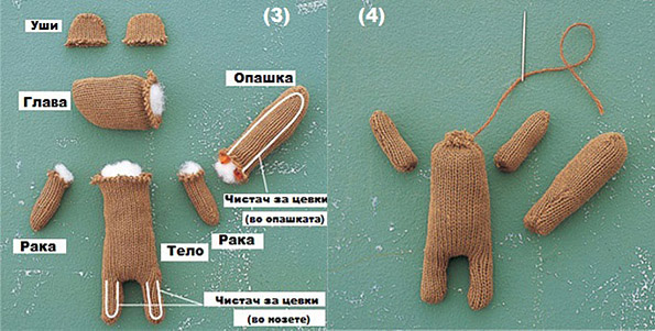 Сега секој од зашиените делови завртете го повторно од другата страна. Трите цевки свијте ги на половина во U облик, притоа двете пократки ставете ги во нозете, а подолгата во опашката. Потоа нозете и опашката наполнете ги со памук, исто така и телото, главата и рацете. Не ги полнете ушите.