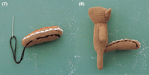 На опашката, со двоен убод направете линија од белиот конец. На истиот начин употребете ги и портокаловиот и темно кафеавиот конец, со растојание помеѓу линиите помалку од 1 см.