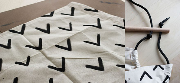 7. Едниот крај на јажето врзете го во јазол, така што под јазолот ќе останат околу 7 цм. Слободниот дел од јажето протнете го надолу низ надворешната дупка на прачката. Продолжете со протнувањето преку долниот (поширокиот) дел на платното, па кон горниот (потесниот) дел. Кога јажето ќе помине низ целиот раб на платното, пред да го протнете низ внатрешната дупка на прачката направете јазол (на околу 90 см од првиот јазол).