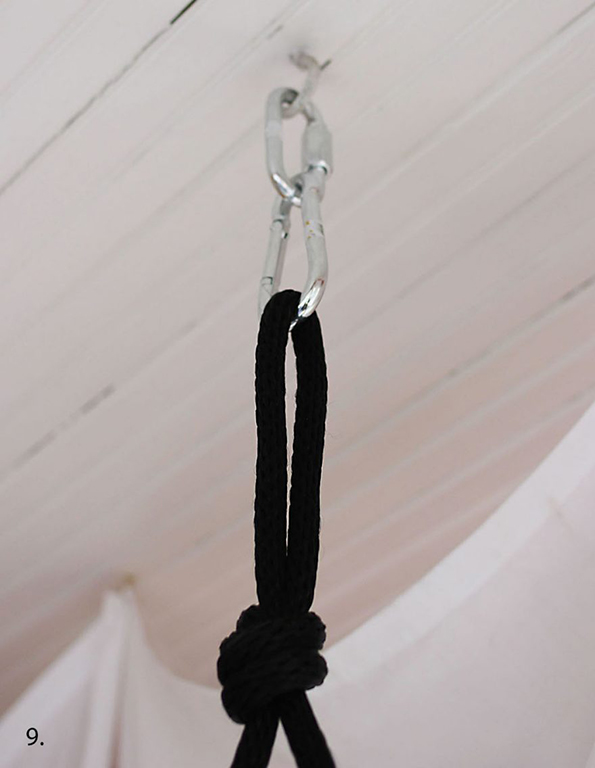 9. Најдете го центарот на јажето над прачката и врзете јазол оставајќи околу 20 цм слободни, па закачете го за куката. Вашата лулашка е готова!