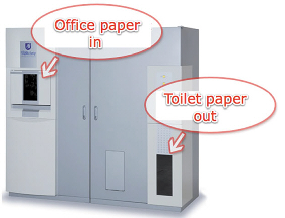 Машината за преработка на отпадна хартија е изум што доаѓа од Далечниот исток. Оваа направа е доволно мала за да може да се смести во секоја фирма, многу е ефикасна, а резултатите се веднаш видливи. За само половина час отпадната канцелариска хартија ја претвора во ролна тоалетна хартија. Хартијата најпрво се меле и кваси со вода, а потоа со помош на валјаци се обликува во тенок слој и се витка во ролна. Единствениот проблем со оваа машина е нејзината цена – 100.000 долари.