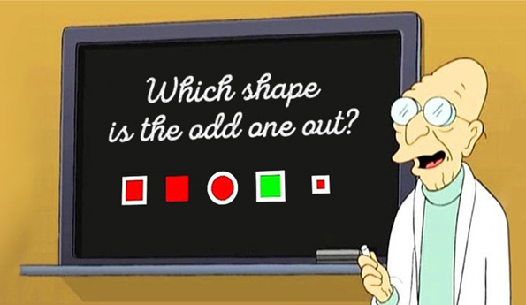 Од прва ќе помислите дека онаа што се разликува е зелената форма. Но, што е со единствениот круг? Или единствениот мал квадрат? Или единствената форма без раб?