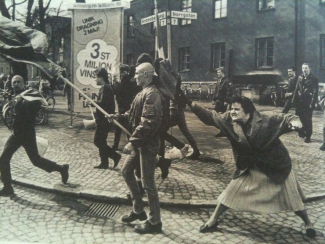 Жена од Шведска, која преживеала концентрационен камп, удира нео-нацист протестант со својата чанта (1985 година)
