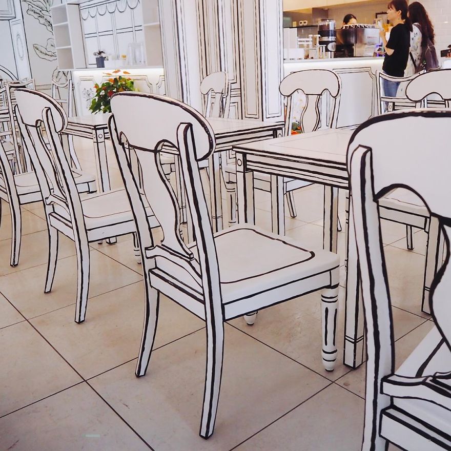 Лоцирано во дистриктот Шин Окубо, ова популарно кафуле е наречено „2D Cafe“. Сè што е во него ќе ве натера да се почувствувате како да сте во стрип, започнувајќи од влезот кој буди ретро чувство, до монохроматскиот декор со бели подови, ѕидови, мебел и други мали детали. Кога ќе го пиете вашиот омилен чај тука, вашите очи ќе бидат збунети и сè ќе ви изгледа надреално! Погледнете…