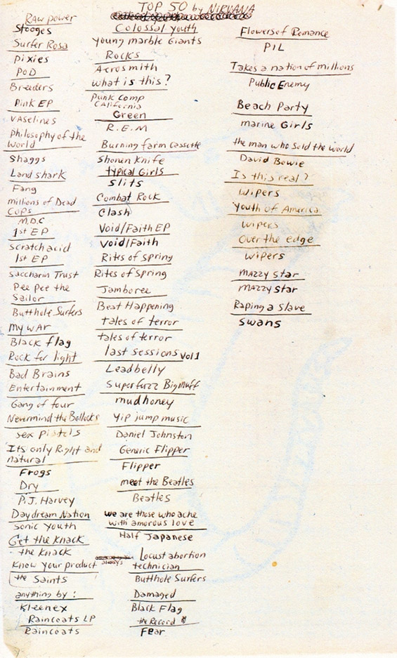 Следната листа со 50 музички албуми е рачно напишана од страна на Курт Кобејн и објавена во книгата „Journals“, во 2002 година. Таа содржи негови белешки, делови од дневници и други работи поврзани со животот на проблематичниот фронтмен на „Нирвана“. Ова е само еден мал сегмент.