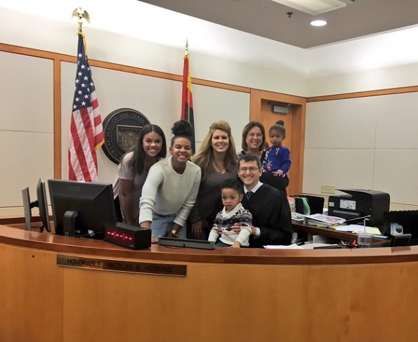 Мајкл Браун, 3-годишно момче, оваа недела конечно било формално посвоено, па толку се возбудило, што не можело да се воздржи за да им ги каже новостите на сите во судницата. Потоа, тој се фотографирал со сестрите од семејството што го посвојува.