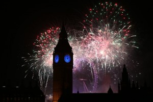 Лондон, Велика Британија – Огномет го осветли небото и кулата Биг Бен. Илјадници луѓе присуствува на брегот на реката Темза за дочекот на новата година