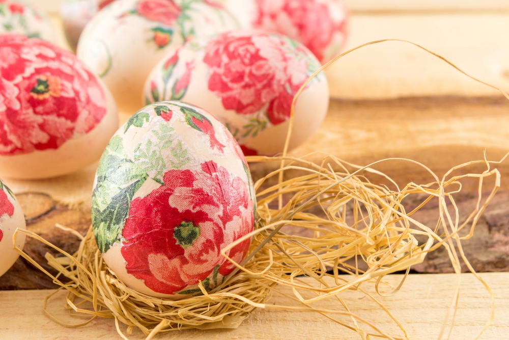 Сè што ви треба се белки од јајца, варени јајца, ножици, четка и салфетки. Важно е да ги исечете најубавите мотиви од трослојните салфетки. За украсување ќе ви треба само еден слој од салфетката. Откако ќе ги исечете деловите од салфетките со кои сакате да ги украсите јајцата, ставете еден слој од салфетката врз јајцето и нанесете со четка од белката врз него. Така салфетката ќе се залепи врз јајцето, а ќе добиете прекрасен ефект. Потоа само премачкајте ги јајцата со масло и оставете ги да се исушат.