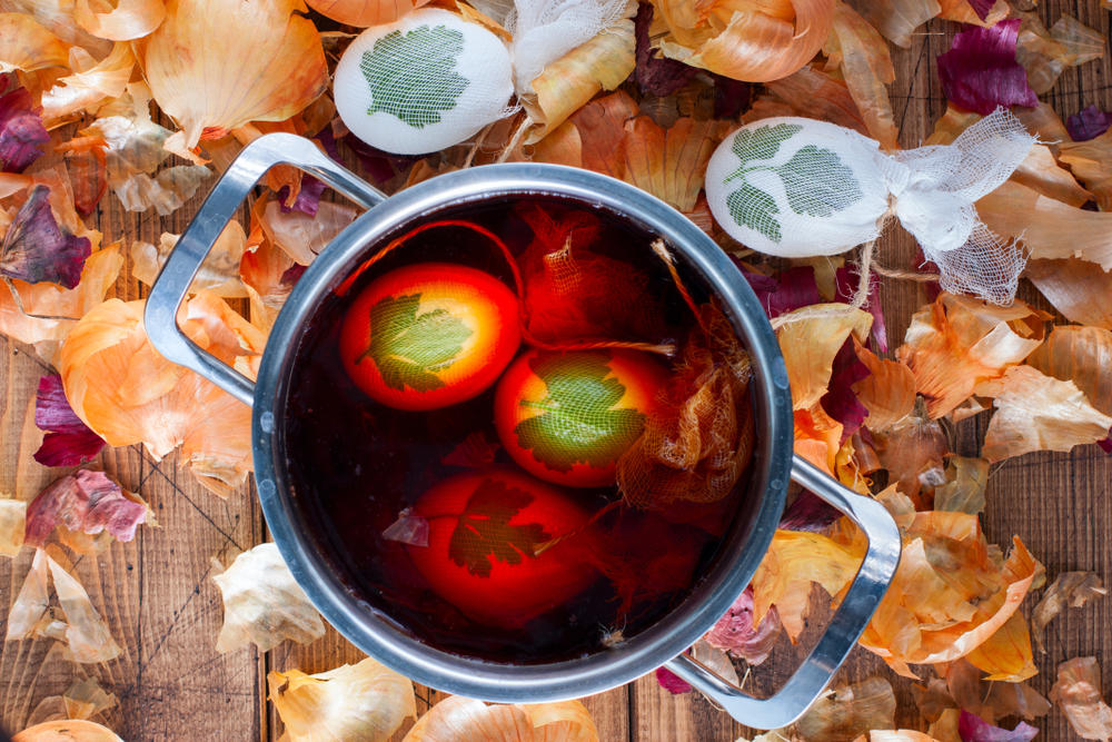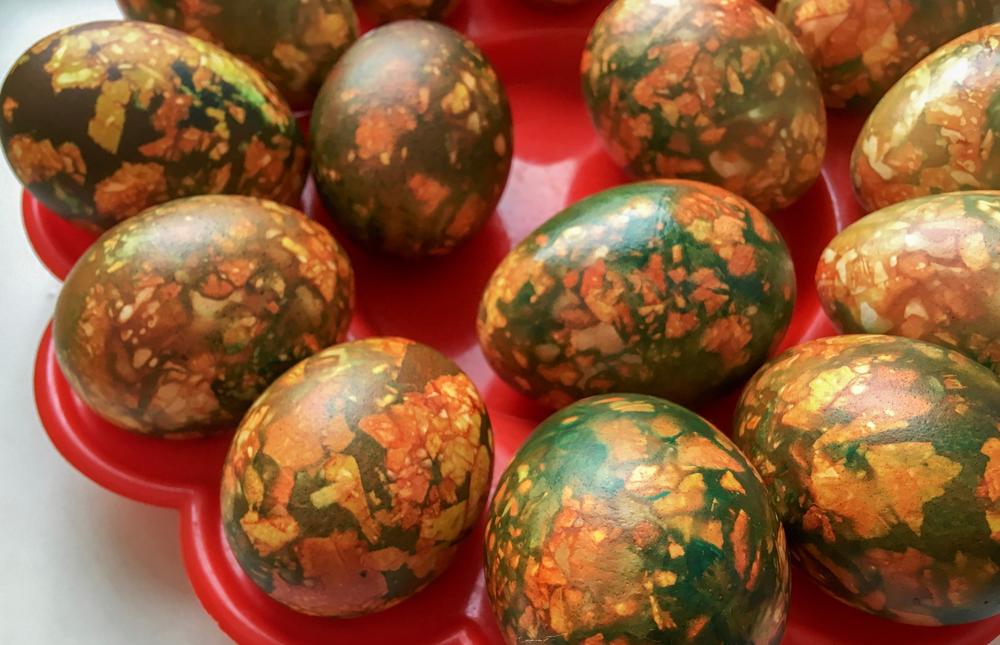 Можеби звучи како нешто комплицирано што одзема многу време и материјал, но всушност е исклучително едноставно. Сè што ви треба се обична боја за јајца и неколку лушпи од кромид. Исечкајте ги лушпите на мали парчиња, а потоа нанесете ги на влажно варено јајце и завиткајте го јајцето во мрежест чорап и ставете го во растворена боја за јајца.