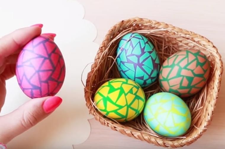 За оваа техника ви требаат две бои (најдобро контрастни) и малку самолеплива трака. Секако и малку трпение – но вреди! Варените јајца прво треба да ги офарбате во едната боја, па да ги оставите да се исушат врз сунѓер, па да им нанесете триаголни облици од самолепливата трака, па да ги ставите во другата боја. Откако јајцата ќе се исушат, треба само да ги отстраните деловите од лепливата трака и добивате прекрасен ефект.