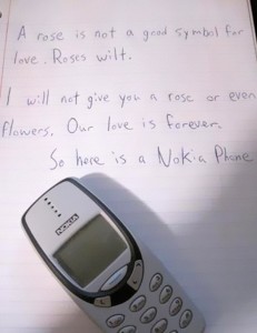 Розата не е добар симбол за љубов. Розите венеат. Нема да ти дадам ниту роза ниту цвеќе. Нашата љубов е засекогаш. Затоа еве ти телефон Nokia.