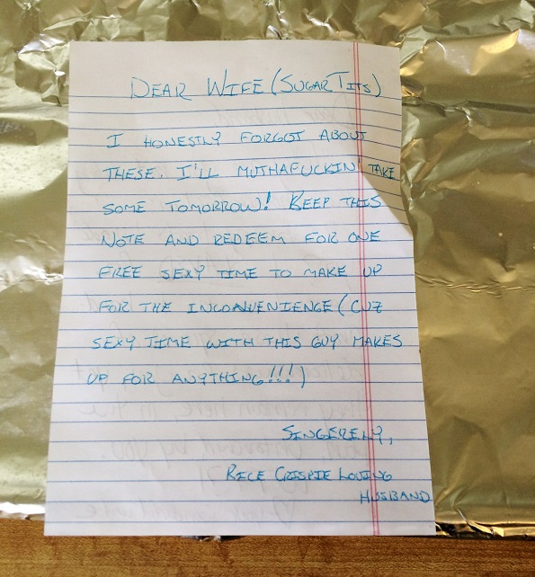 Драга жено (шеќерни гради), најискрено заборавив на овие. По ѓаволите, ќе земам утре. Задржи ја пораката и ќе се откупам со едно бесплатно секси поминато време за да се оддолжам за непријатностите (бидејќи секси време поминато со овој дечко надокнадува за сѐ!!!) – Искрено, твојот Рис крцкаво љубен маж