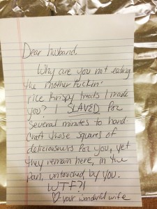 Драг мажу, зошто не ги јадеш проклетите крцкави слатки од ориз кои ги направив за тебе? Робував неколку минути за со свои раце да ги оформам тие вкусни деликатесни коцки за тебе. Но сепак, еве ги тука, во тавчето, не си ги пипнал. Што по ѓаволите? – Твојата прекрасна жена