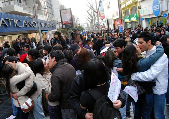 Повеќе од 100 студенти и ученици се вклучиле во овој несекојдневно интересен протест во Сантјаго, Чиле за да се побунат против стандардите во образовниот систем и големите трошоци поврзани со него. Тие ги споија усните пред Митрополитската катедрала и на 1 септември, а минувачите морале да подзастанат за да видат што се случува. Страсната сцена ги штрекнала децата и постарите луѓе, а дел од луѓето биле пријатно изненадени и го поздравиле потегот со аплауз.