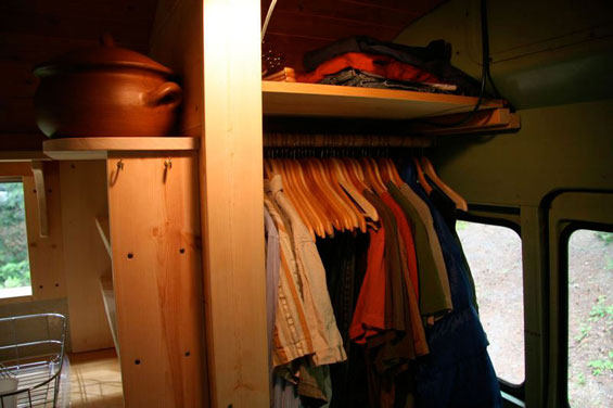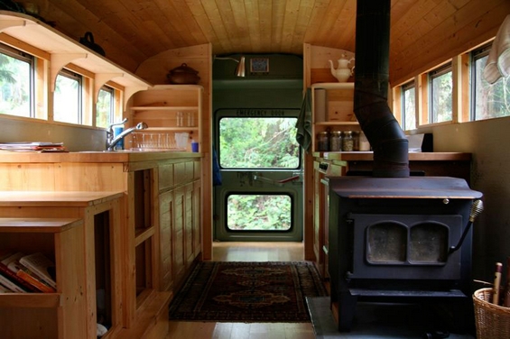 Прекрасниот дрвен ентериер му дава едно навистина комфорно и пријатно чувство на овој мал движечки дом. Во него има целосно функционална кујна, камин за греење, кауч за спиење, работно биро и полици кои ги држат работите за да не паднат при патување.