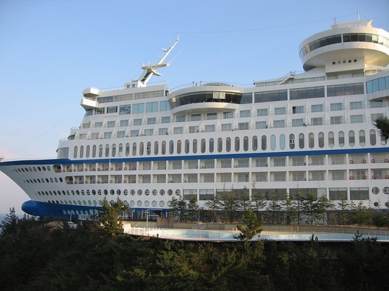 Качен на врвот на една карпа на брегот во Џионгдонгџин, туристички град во Јужна Кореја, овој брод е првиот кој може да ве одведе на крстарење на суво.