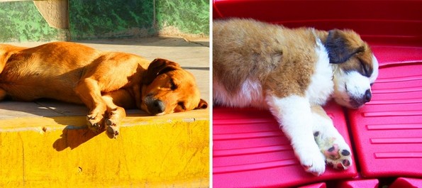 Оваа е најпопуларната положба на спиење кај кучињата. Положбата му овозможува на животното брзо да стане доколку се појави некаква опасност. Исто така најчесто кучињата не се во длабок сон во оваа положба, туку дремат. Ова е положба за чување.