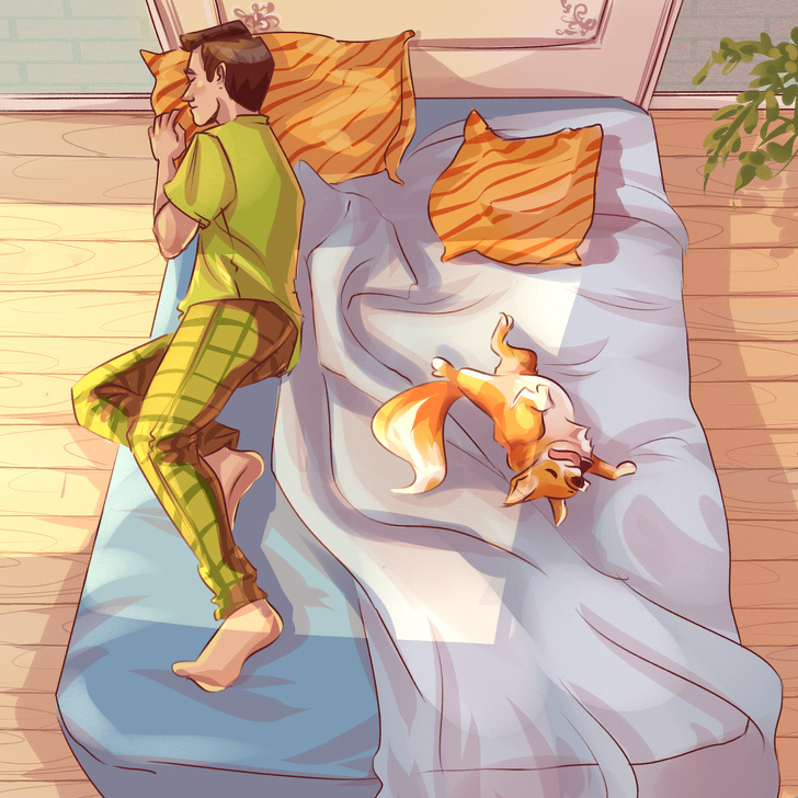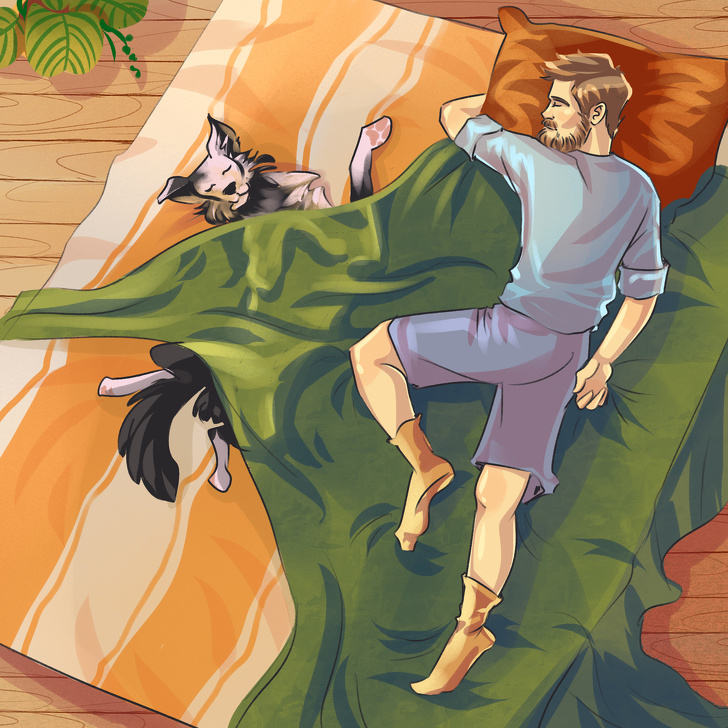 Вашето милениче се протега веднаш до вас и во оваа положба почесто спијат кучињата, а мачките многу поретко. Животното сака да одржува близок контакт со вас колку што е можно подолго, додека ужива во галењето. Покрај тоа, миленичето ја избира оваа положба за да биде подготвено да реагира брзо на какви било ризични фактори и да го заштити својот сопственик.