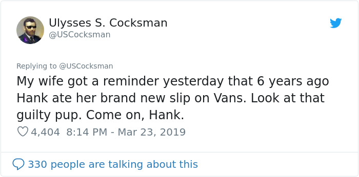„Мојата сопруга вчера доби потсетување дека пред шест години Хенк го изеде нејзиниот нов пар Vans еспадрили. Погледнете го ова виновно кученце. Ма ајде Хенк.“