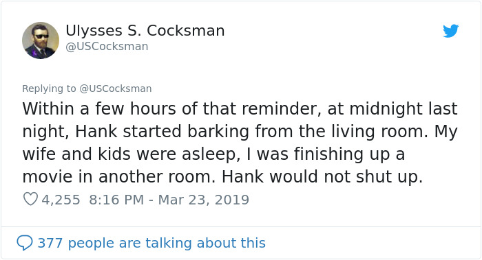 „Неколку часа по тоа потсетување, на полноќ минатата вечер, Хенк почна да лае од дневната соба. Мојата сопруга и децата беа заспани, а јас догледував еден филм во другата соба. Хенк не замолчи.“