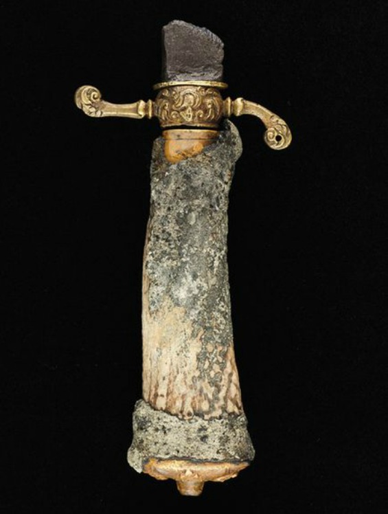Може ли оваа позлатена урна да биде дел од мечот на познатиот пират од 18-от век, Црнобрадиот? Не може со сигурност да се знае, но се претпоставува, со оглед на тоа дека е откриена во Северна Каролина крај остатоците од бродоломот, кој се верува дека е како резултат на одмаздата на кралицата Ана.