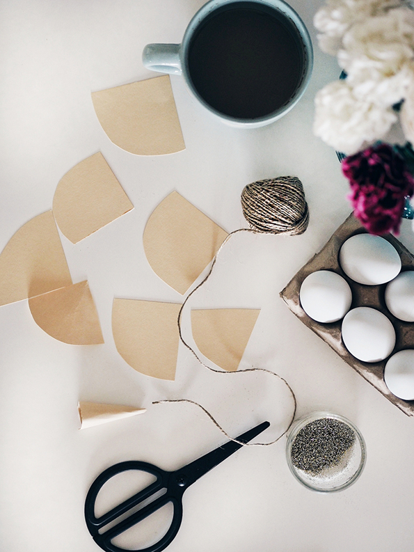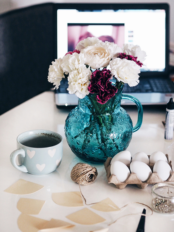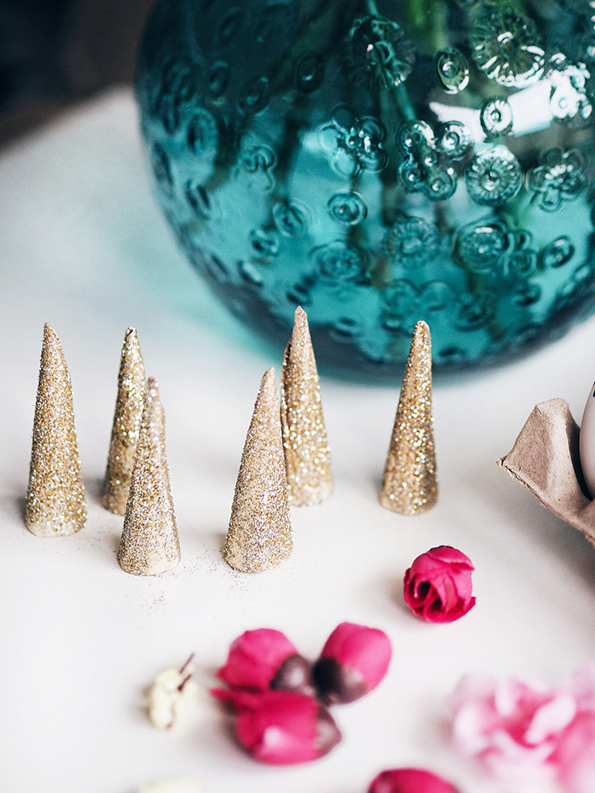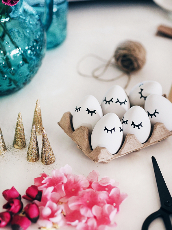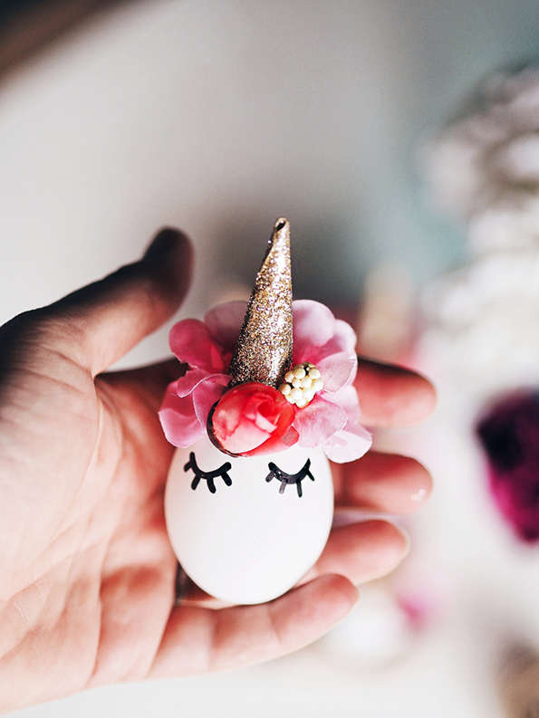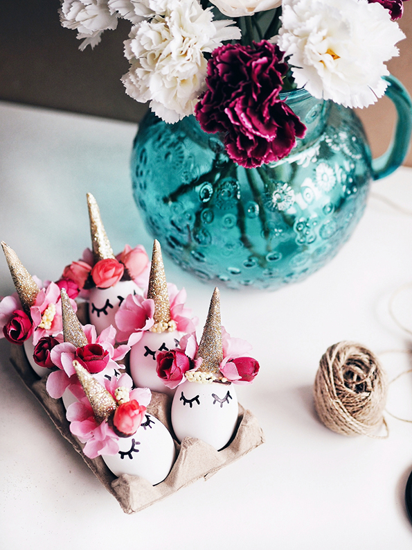 Направете мали конуси од дебелата хартија, па декорирајте ги со лепилото и светките. Потоа, со помош на пиштолот за топло лепило, залепете ги „роговите“ на врвот од јајцата. Со црн маркер внимателно нацртајте ги очите и трепките. За крај, наредете ги цвеќињата по ваш вкус и прицврстете ги со помош на лепилото.
