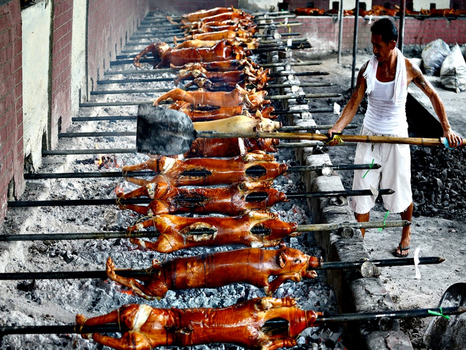 Лечон (Шпанија и нејзините колонии). Слично како и кај нас, и Шпанците целото прасе го ставаат над жар и го вртат додека не се испече убаво.