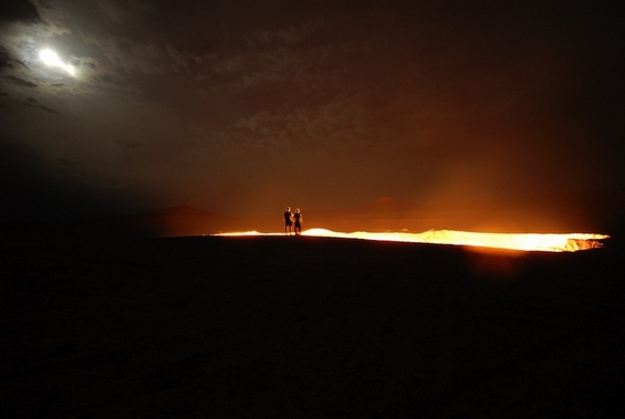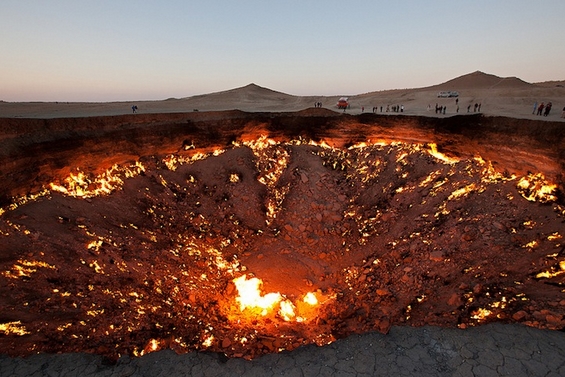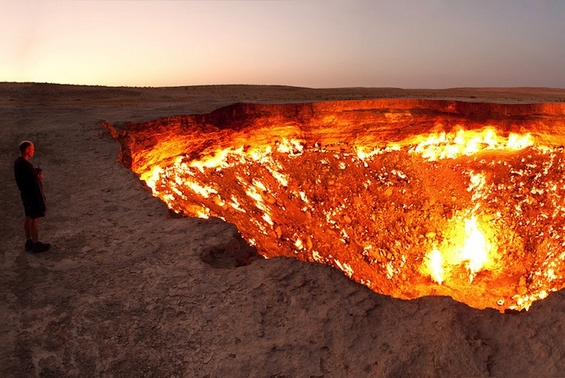 „Врата кон пеколот“ е соодветно именувано поле со гас во пустината Каракум во Туркменистан, кое гори веќе подолго од 40 години. Разгорениот кратер првин бил пронајден од страна на советските научници во 1970 година, како област полна со ресурси на гас. За жал, земјиштето пропаднало од тежината и притисокот на платформата за нафта поставена на местото.