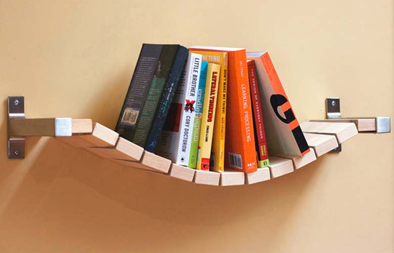 Оваа полица има многу интересен ефект. За да ја направите, потребно е да издупчите по две дупчиња на секоја од летвите, а потоа да провлечете јаже низ секоја од нив. На крај, прицврстете ги на некој метален дел, а потоа на ѕидот.