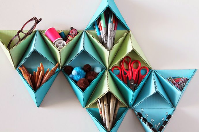 Од картон со трапезоиден облик направите пирамиди и спојте ги на подлога од картон. Оваа полица е одлична за на ѕидот над работното биро.