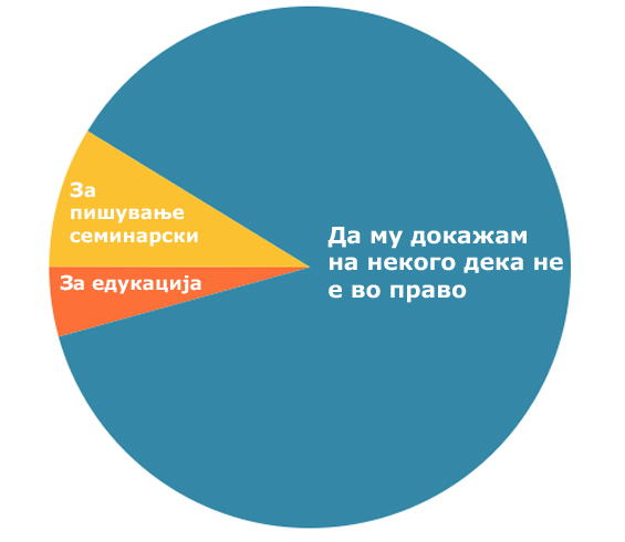 Најпопуларната бесплатна онлајн-енциклопедија „Википедија“ моментално има околу 30 милиони текстови напишани на 286 јазици, од кои дури 4,2 милиони се на англиски, а нешто помалку од 73.000 на македонски. На неа може да се најде сè и сешто, па токму затоа е многу посетувана. Ова се причините поради кои најчесто се користи „Википедија“.